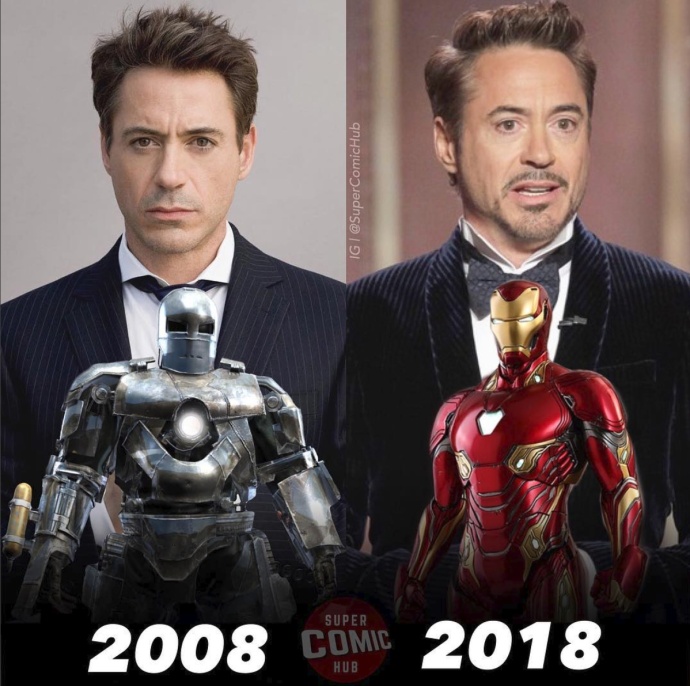 ▼「鋼鐵人」小勞勃道尼(Robert Downey Jr.)在 2008 年第一次演出漫威電影時還是相當粉嫩的大帥哥,經過 10 年之後的東尼史塔克更加內斂穩重,鋼鐵人也從第一集逃命的最出版,進化成《復仇者聯盟3》最新版盔甲。