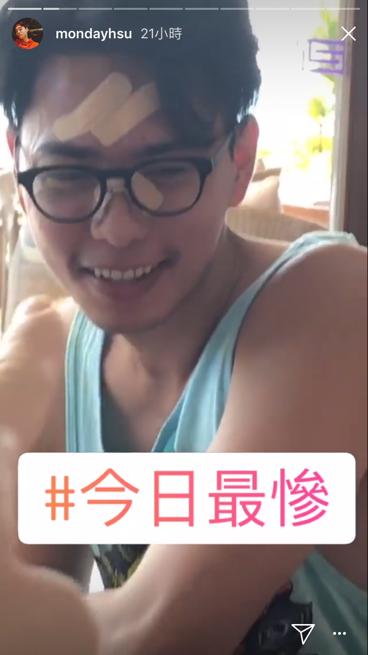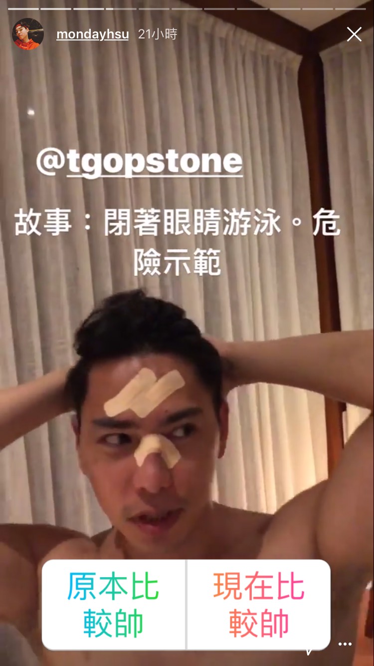 展瑞也笑說:「愛玩,還好皮肉傷」其實石頭雖然掛彩,看起來卻也並無大礙,後來還貼著OK蹦對鏡頭擺出帥氣的pose。之後展瑞也說明石頭受傷的原委:「閉著眼睛游泳。危險示範」顯然石頭真的是貪玩,展瑞還搞笑開二選一投票詢問是原本比較帥還是現在比較帥XD