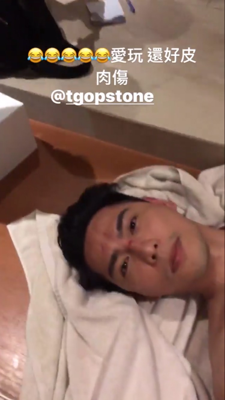 近日石頭和這群人的展瑞、木星和好友一起在越南玩,不料竟然傳出意外。24日展瑞在IG限時動態中,PO出了石頭倒地鼻梁滲血掛彩的照片,只見照片中石頭躺在地上墊著毛巾,本來高挺帥氣的鼻樑卻出現一道明顯傷口,除了鼻樑之外,可以發現其實石頭的額頭也有撞到的痕跡,雖然沒有鼻樑嚴重,看起來也是相當驚人。