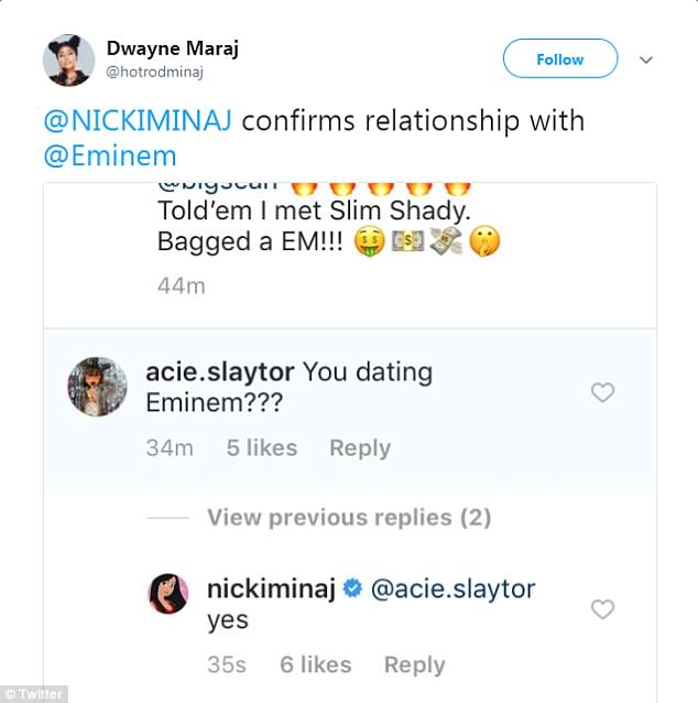 ▼由於推特上有粉絲盛傳妮琪米娜現在正與另一位饒舌界的傳奇阿姆約會中,因此有粉絲直接向妮琪米娜詢問八卦,沒想到妮琪米娜居然坦率地回應一個字:「yes。」讓推特瞬間為妮琪米娜承認與阿姆交往中的消息引發轟動。