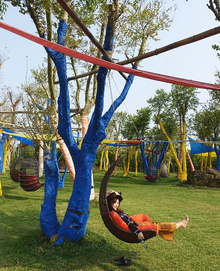 通常來說,露營就是要吹大自然的風,棚內也很少會再牽冷氣線讓你吹冷氣。不過寨酌然 野奢庄園的星空帳篷是有空調的喔!!舒適地睡了一覺後,園區內還有許多顏色繽紛的吊椅,可以乘涼、聊天、打卡拍照。小編大大大推!