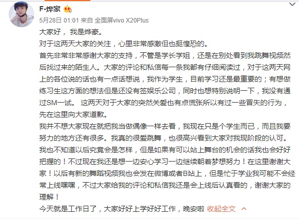 首先非常非常感謝大家的支持,不管是學長學姐,還是在別處看到我跳舞視頻然後找過來的陌生人。大家的評論和私信每一條我都有仔細閱讀過,對於這兩天網上的各位說的話也有一點話想說,我作為學生,目前學習還是最重要的;有想做練習生這方面的想法但是還沒有簽名娛樂公司,同時也想特別說明一下,我沒有通過SM一試。這兩天對於大家的突然關愛也有點慌張所以有過一些冒失的行為,先在這裡向大家道歉。