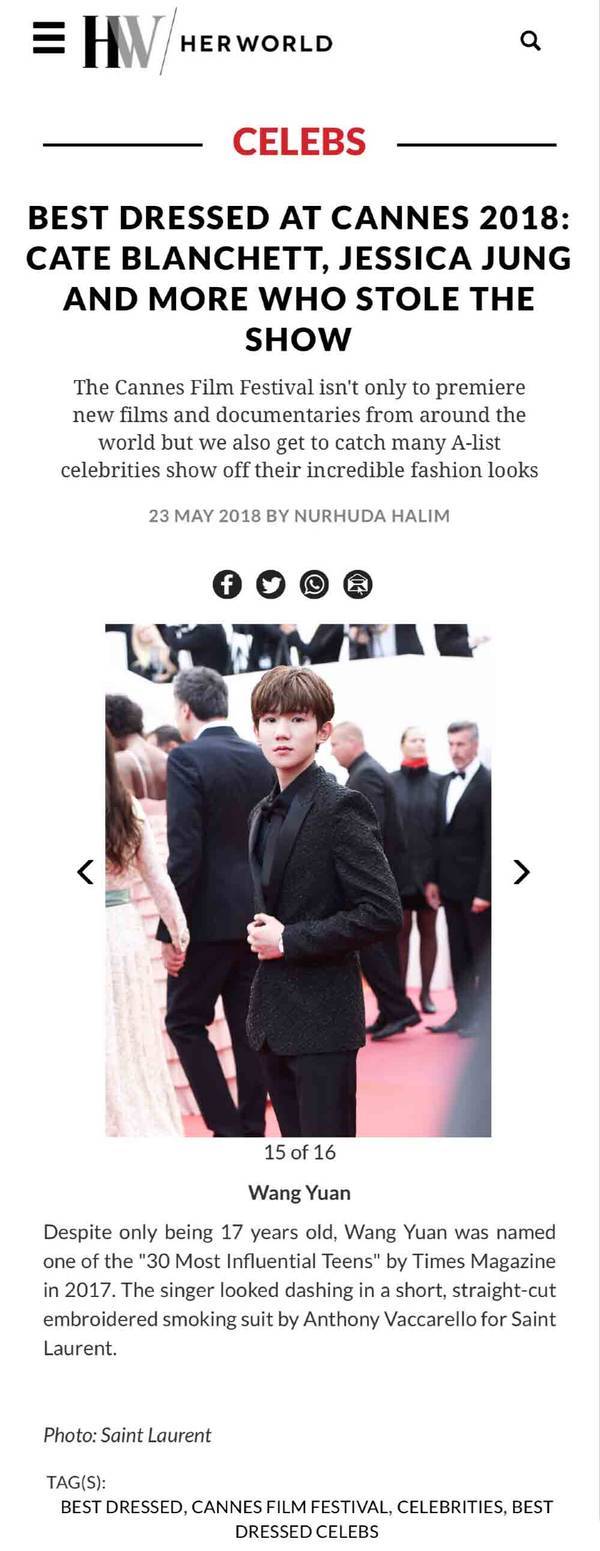 2018年5月10日,第七十一屆坎城電影節盛大開幕,王源也受邀出席坎城紅毯,並以初次「坎城首秀」被新加坡時尚雜誌《Herworld》評選為「2018年坎城電影節最佳紅毯著裝」,來自各國的14位元明星共計16套造型入選,王源作為唯一的男性亦是唯二的華人在列。評語之中寫道:「儘管只有17歲,王源曾在2017年被《時代雜誌》評選為“30位最具影響力青少年”之一。這位歌手身著由安東尼·瓦卡萊洛設計的聖羅蘭短款直裁西裝,看起來英俊瀟灑。」