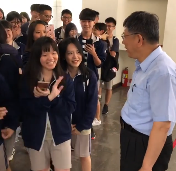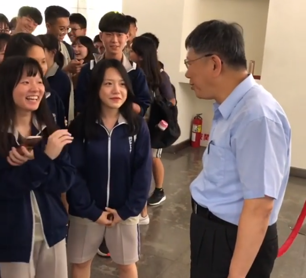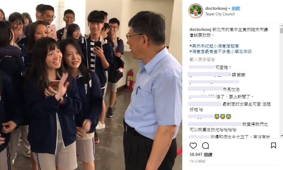 昨(29)日台北市長柯文哲的IG放上了一段影片,並且打上:新北市的高中生竟然跑來市議會說要找我。」影片中可以看到柯P當時正要前往備詢,卻被一群學生圍繞,學生們興奮地拍照、握手,他也相當親民地和學子們寒暄。此外柯P也自嘲:「果然年紀越小滿意度越高」、「滿意度最高差不多是小學五年級」相當幽默。