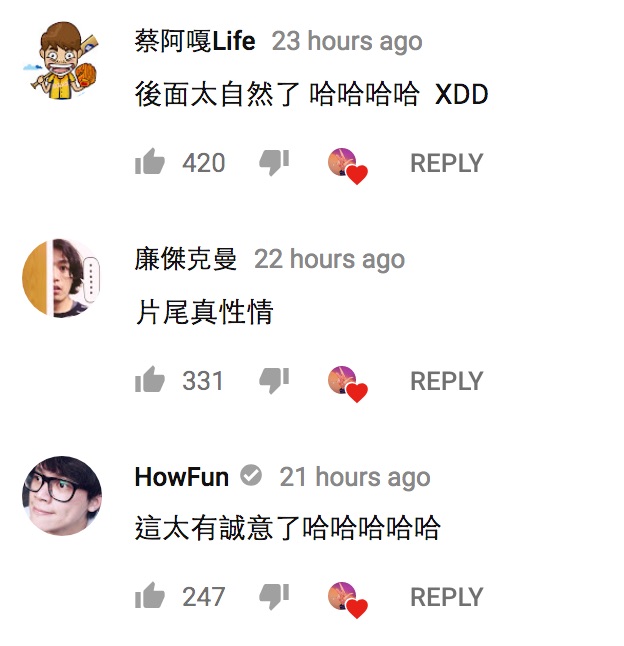 最後影片結尾試圖淡出畫面,卻不小心撞翻檯燈還跌倒,團員也紛紛在下方留言「太自然了」、「真性情」,howhow也表示「太有誠意」