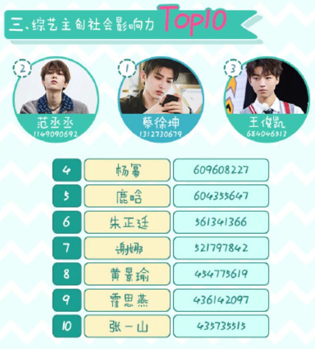 新浪娛樂最新一期的明星勢力榜調查再度出爐,本期綜藝主創社會影響力的冠軍繼續由「流量新人王」蔡徐坤拿下,第二名則是范冰冰的弟弟范丞丞,TFBoys團員王俊凱則拿下第三。