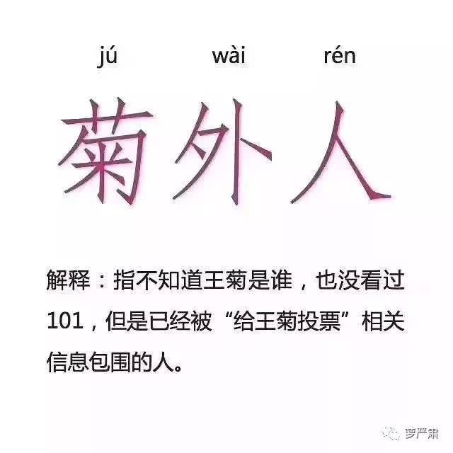 隨著王菊的爆紅,網路上也出現了一系列「菊式用語」以及王菊表情包為她打Call,她的男粉絲們自稱「陶淵明」,因陶淵明獨愛菊;女粉絲們自稱「沈眉庄」,因為《後宮甄嬛傳》中眉庄住在存菊堂,粉絲們的趣味造詞以及積極造勢,讓幾乎不是她的粉絲都在為她投票,也因此衍生出網路新詞「菊外人」,笑翻一眾網友。