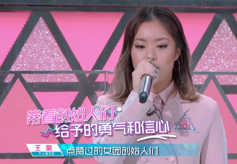當黃子韜問及名次逆轉的感想,王菊謙虛的表示自己第一次站在金字塔上看著下面,而且終於穿上有顏色的衣服,往後她將不只為自己而戰,下一次地公演,她同時也要為支持她的所有人而戰。此番感言也讓現場練習生感動不已,直呼:菊姐好棒!