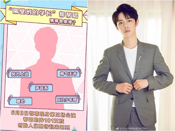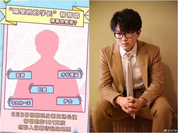 第五位是以「高萌、才華橫溢、巨星、平凡的一天、護士」被預測的的毛不易,將與楊超越合作歌曲《不負青春》,第六位線索也相當簡單粗暴,以「X玖少年團、暖心、聲音酥、帥氣王爺、努力上進」被預測是男星肖戰,將和孟美岐組搭檔歌曲《我就是這種女孩》。