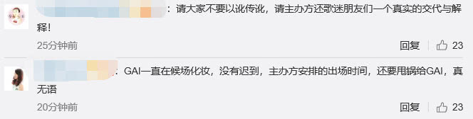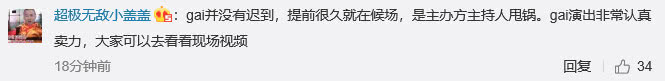 後來也有歌迷出來澄清,當時的情況是GAI早就在後場侯台,是主辦方和主持人一直拖時間,GAI才沒有出現的,其實GAI沒有任何責任,主辦方最後將鍋甩到了GAI的身上,也給GAI的聲譽帶來了很不好的影響。所以說耍大牌根本是不存在的。