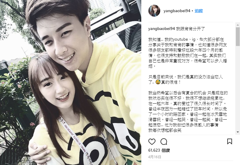 而這部影片卻讓網友看的超尷尬,原來肯肯和楊寶貝在四月中時已經分手了!肯肯與楊寶貝在一起六年,在一起的過程相當甜蜜,網友也一直很喜愛他們,怎料最後卻分手收場。據了解此支影片是三月份時兩人和好友一起來台灣玩時錄製的,當時兩人還在一起,沒想到兩人回馬來西亞之後,居然在4月16日宣布分手。而他們也在社群上說明分手原因,解釋兩人前陣子都經歷了低潮,最後無法和彼此好好相處,才決定分開。