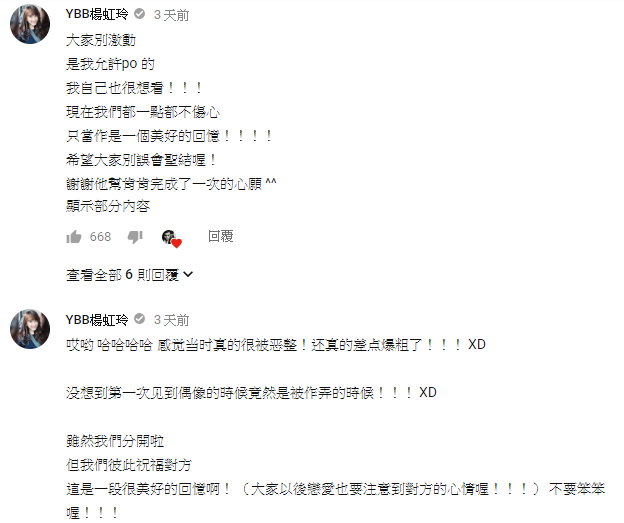 而聖結石這支影片發布之後,網友頻頻在下方留言:「尷尬...」、「有點尷尬囉,現在才上片... 他們分手了...」、「放出来有點不好吧現在來講」、「YBB都分手了會不會觸景傷情阿」、「現在發出來~~感覺怪怪的」、「影片出的時間很尷尬」。而楊寶貝也在影片下方留言表示是自己允許PO的,別誤會聖結石,並且表示雖然已經分手但彼此都祝福對方:「這是一段很美好的回憶!」