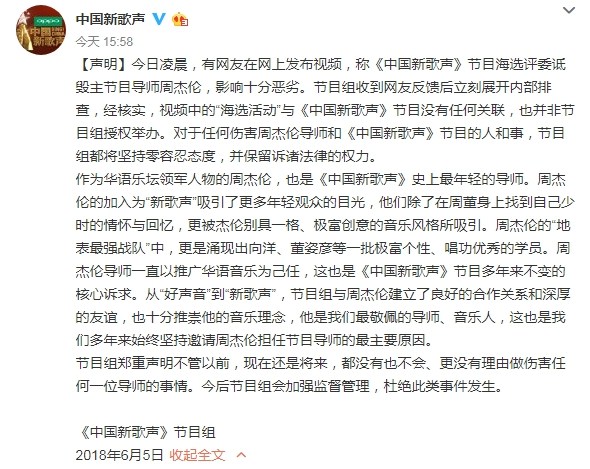 不過稍早《中國新歌聲》節目組也在官方平台上發表聲明,證實該影片與節目組毫無關聯,海選賽也並非節目組所舉辦。並聲稱節目絕不會傷害導師,並承諾將加強監督管理,杜絕再次發生。網友們對於節目組的聲明則持保留態度,並警告節目組不要惡意消費周杰倫。