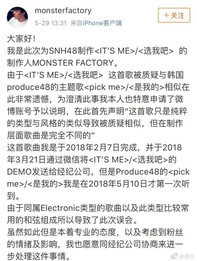 而《選我吧》的製作人也在網路上發表聲名否認抄襲,說:「這首歌只是純粹的類型與風格的類似導致被質疑相似,但在製作層面歌曲是完全不同的」。並附上證據證明時間上,他的Demo是早於《PICK ME》(내꺼야)。