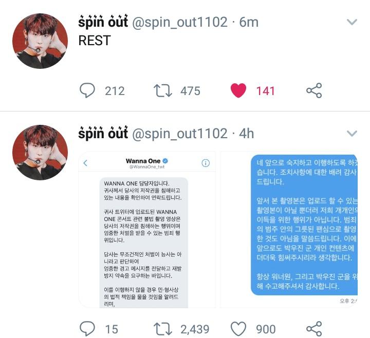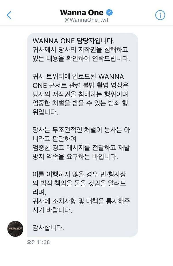 就在首爾的演唱會結束後,許多站姊們紛紛在Twitter上公開高清飯拍照和影片,讓許多粉絲開開心心地存圖,但有些站姊也公開了由Wanna One官方推特傳來的給私訊!內容是說這些站姊侵犯肖像權和著作權,要求他們刪除演唱會上所拍的影片和照片,否則公司會採取法律措施。因此,多個站子集體刪除所有在《Wanna One World Tour - One: The World》演唱會上拍的視頻和照片,更有許多站子宣佈關站、休站,令粉絲們驚慌不已!