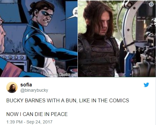 事實上漫威漫畫中的巴奇·巴恩斯也有出現綁起包頭的畫面,因此賽巴斯汀·斯坦在電影中還原之時,更是令許多觀眾狂讚,也激發許多畫手繪製出美國隊長幫巴奇綁頭髮的想像畫面,你是不是也被這個髮型的賽巴斯汀·斯坦給電暈了呢?
