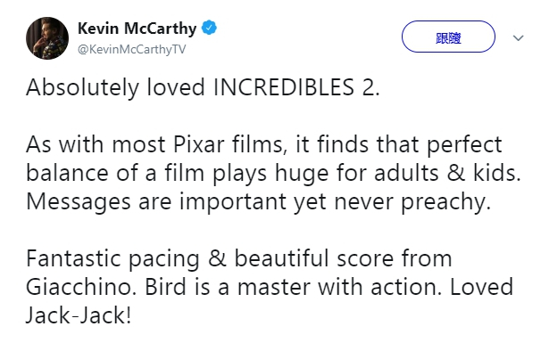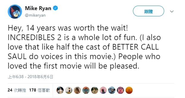 ▼《超人特攻隊 2》首映會後,各大電影媒體影評也紛紛出爐,哈芬登郵報的 Mike Ryan 就表示:「14 年的等待絕對值得!《超人特攻隊 2》太有趣味了,如果你是第一部的粉絲,那你絕對也會喜歡第 2 集。」Kevin McCarthy 則表示:「超愛《超人特攻隊 2》!就像絕大多數皮克斯電影,它總能在大人和孩子們之間找到完美的平衡點,電影節奏步調絕妙,Giacchino 的配音更是美極了!導演布萊德·博德在動作安排上就是大師!太愛巴小杰了!」