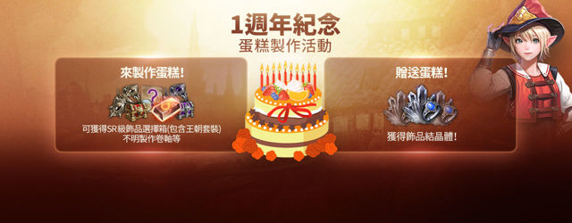 此外,還有一週年的蛋糕製作慶祝活動,玩家每日能藉由完成遊戲內任務獲得點數,使用點數後能製作蛋糕並獲得不明製作卷軸、SR 級飾品選擇箱和其他獎勵。此外,玩家也能於地圖上找到寶箱並獲得馬夫勒的庇佑、祝福的強化卷軸、UR 級超越石和更多獎勵。
