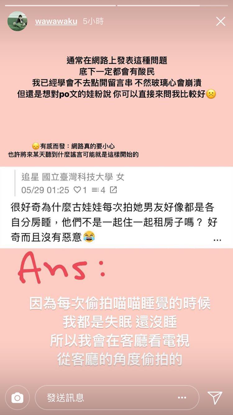 日前就有網友在Dcard上發文表示「很好奇古娃娃每次偷拍男友好像都是分房睡」,也讓古娃娃親自說明,是因為她每次偷拍男友都是她失眠的時候從客廳偷拍的,也讓她呼籲粉絲,希望可以直接來問她,不然謠言可能就是這樣出來的。