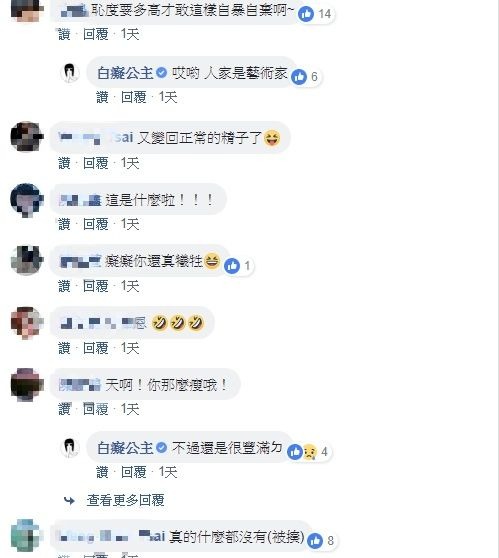 無碼版照片一出又立刻抓住粉絲的眼球,有人認為「癡癡」根本自毀形象,紛紛留言:「為藝術犧牲的癡癡」、「恥度要多高才敢這樣自暴自棄阿」,不過還有人眼尖發現,打馬賽克的畫面似乎幫「癡癡」加料,直言:「為何打了馬賽克身材變正了?」、「 A--確認無誤」、「馬賽克下去就不是A-了耶」,而癡癡也尷尬的回應:「這就是選擇碼的原因…」