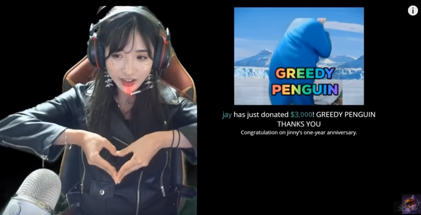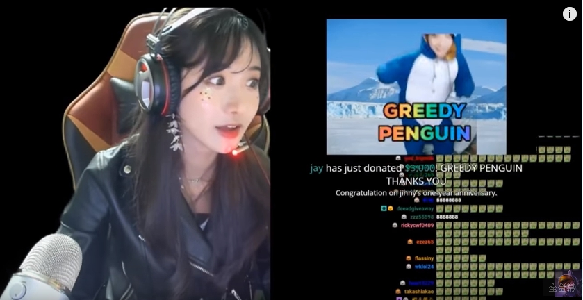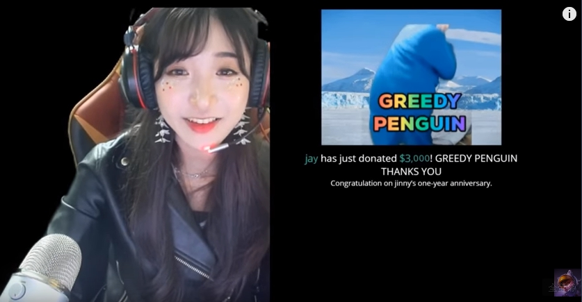 「企鵝妹」日前曾被爆光是1個月的「斗內」(捐贈、贊助)就賺進55萬台幣,當時就嚇壞不少人!在8日時,適逢「企鵝妹」實況周年的紀念日,她特別開直播慶祝,並跳起《可愛頌》舞蹈,跳沒多久之後,直播畫面就跳出一位被網友稱作「周董」的乾爹「Jay」砸3000美元(約9萬台幣),這大筆金額來得太突然,讓「企鵝妹」當場嚇傻,驚呼:「3000美金太多了拉!」完全被震懾住,就連觀眾都跟著暴動,直播間的聊天留言功能一度當機。