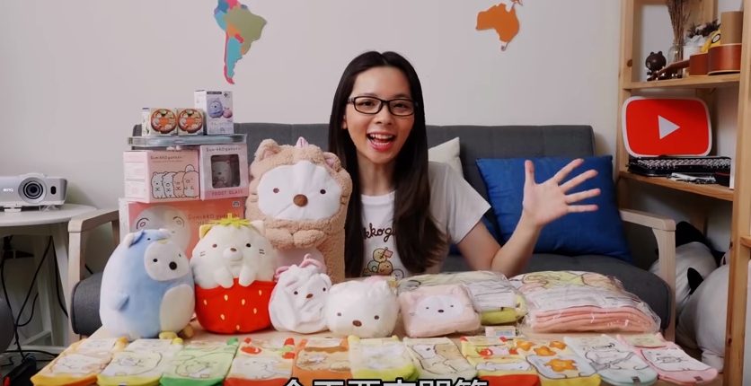 在一整桌上,可以看到襪子、玩偶、被子、錢包、手機坐墊、吊飾等等,每個商品都被滴妹說的「很有用處、很有意義」,自認為買東西有分寸,沒有買超過,最後更是力推粉絲一定要將「角落生物」帶回家,滴妹表示,這趟日本遊,她將所有的零用錢都花在角落生物上面,一切都花得很值得!