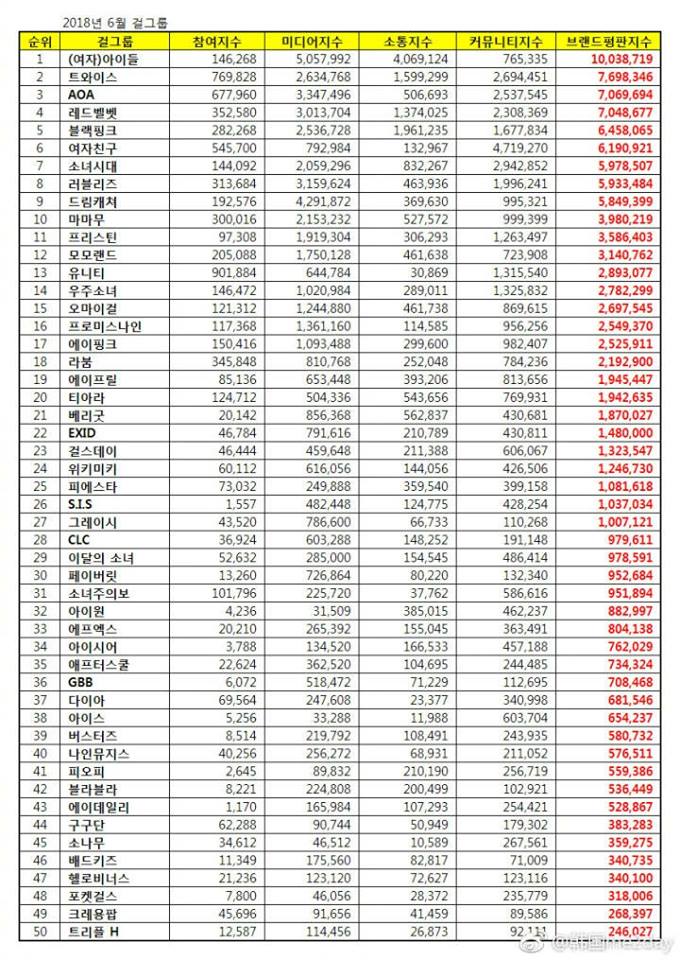 最近,在韓國媒體公布的6月女團品牌評價中,G I-DLE(여자아이들)更擠下了TWICE、Red Velvet等大勢女團,摘得6月女團品牌評價1位,綜合品牌評價指數更高達1,003萬8,719分!排名第二的則是TWICE,綜合品牌評價指數為769萬8,346分;第三名是最近剛回歸的AOA綜合品牌評價指數706萬9,694分。希望G I-DLE和TWICE都能持續大發,台灣女孩也都加油!