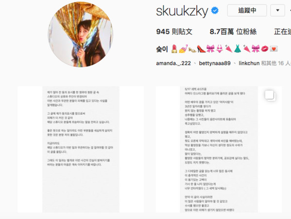 席捲好萊塢的「Me, too」運動,讓許多人站出來發聲,控訴曾經因權力不對等而遭受性騷擾、性侵害的過程,而在男女十分不平等的韓國也有許多人跟上了這股運動風潮,也讓許多政治人物被起底曾經做過的壞事。而日前有一名韓國小模楊藝媛在網上訴說自己在一個叫「合井once picture攝影棚」的地方被騙拍裸照的經歷,讓「國民初戀」秀智也發聲支持,跑到青瓦台頁面下請願調查「合井once picture攝影棚裸照事件」,並截圖發在自己的IG限時動態,讓這個請願瞬間有超過11萬參與支持。