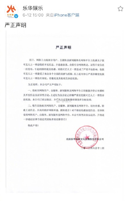 消息傳出後,王一博的經紀公司「樂華娛樂」在第一時間發出澄清聲明,指稱網友的爆料不實,並表示「該傳言對我司藝人王一博造成了嚴重的影響,使其蒙受來自各個方面的誤解與質疑,且內容嚴重涉嫌侵犯王一博名譽權、肖像權及其他相關合法權益。」呼籲大眾勿聽信流言並自重,並指出公司已依法取證,將委託律師全權處理。