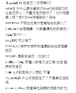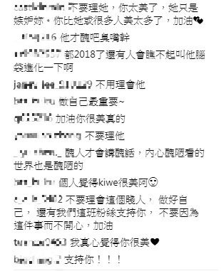 感性文一出,讓不少粉絲相當心疼:「做自己最棒」、「內心醜陋看的世界也是醜陋的」、「不明白他有什麼資格去批評人」、「辛苦妳了,不要理會異樣眼光和批評,妳就是最美的。」