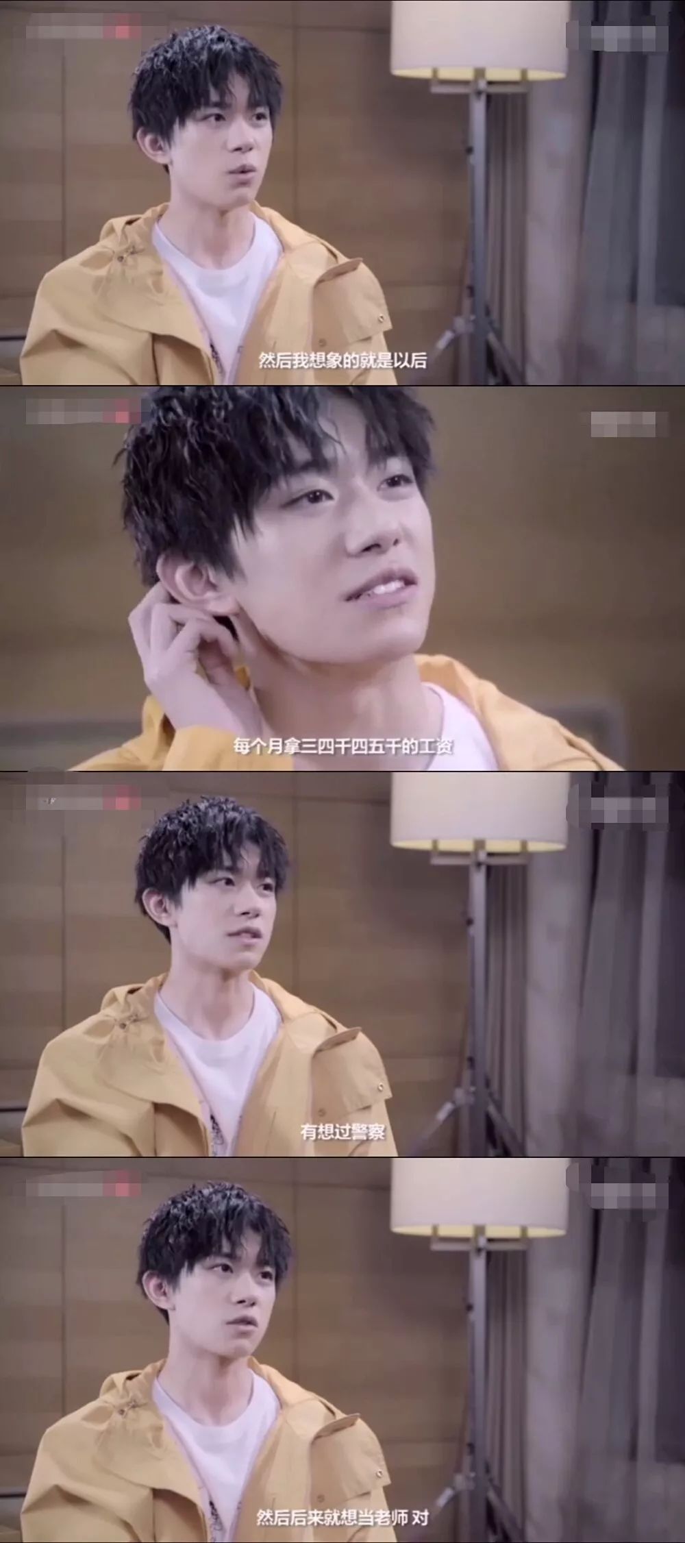 易烊千璽以前說過自己想當舞蹈老師,而之前也說過要開自己的舞蹈工作室。雖然比較忙,但是也一直朝著這個目標在努力。主持人接著問說人在十三歲到十八歲,是真正產生自我認知的那幾年,現在對未來有什麼感想?易烊千璽很真誠的回答說:十三四歲的時候是被選中,公司安排做什麼事情就按照他們碼好的路走就行。