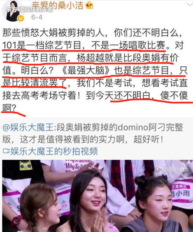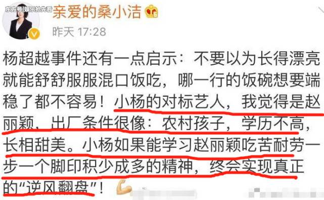 綜藝節目《最強大腦》的製作人桑潔更在微博說出了身為業界人士對楊超越事件的看法。桑潔認為如果自己是楊超越的經紀人或是製作人,會想辦法讓楊超越成為草根廢柴的代言人,讓所有的觀眾知道,世界上就是存在著「怎麼努力也做不好的普通人、怎麼努力也考不到高分的學生、怎麼努力也沒法升職加薪的白領、怎麼努力也減不了肥的男人女人」的人,但是楊超越可以給觀眾展現「我存在的意義,就是哪怕再一無是處的人生,只要認真地活著,總會遇到欣賞你的人,因著這份欣賞,你就會向陽而生。」這份力量。桑潔更指出,楊超越現象更給了大家另一個啟示,那就是不要以為長得漂亮就能舒舒服服混口飯吃,只有努力站穩腳步才是成功的關鍵。