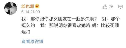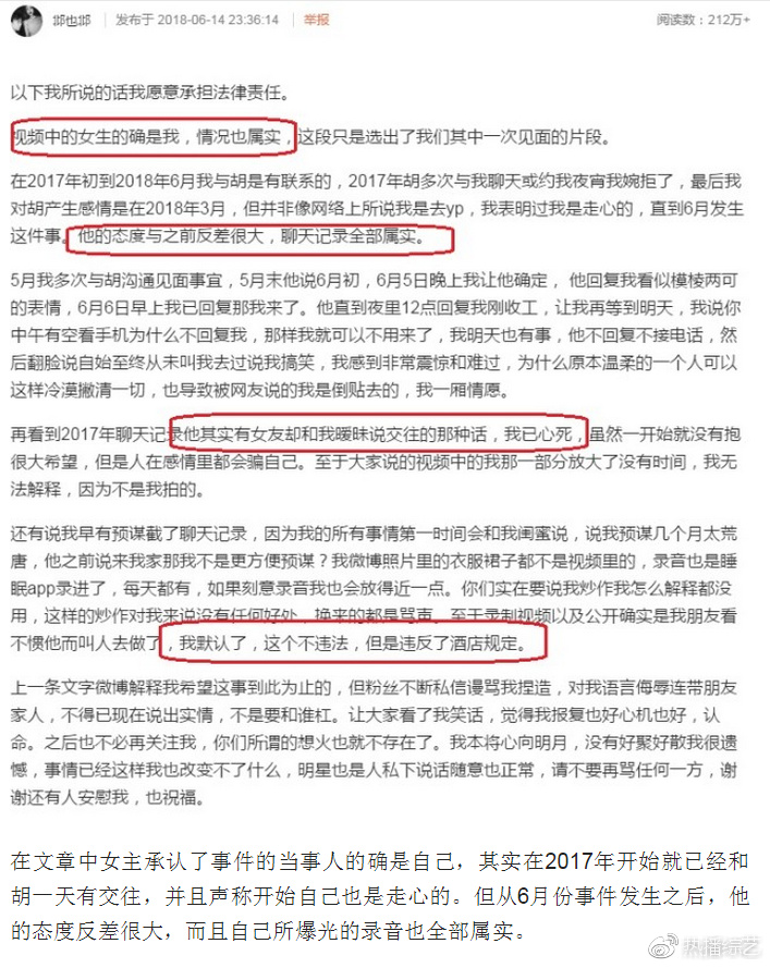 在2017年初到2018年6月我與胡是有聯繫的,2017年胡多次與我聊天或約我夜宵我婉拒了,最後我對胡產生感情是在2018年3月,但並非像網絡上所說我是去yp(約砲),我表明過我是走心的,直到6月發生這件事。他的態度與之前反差很大,聊天記錄全部屬實。