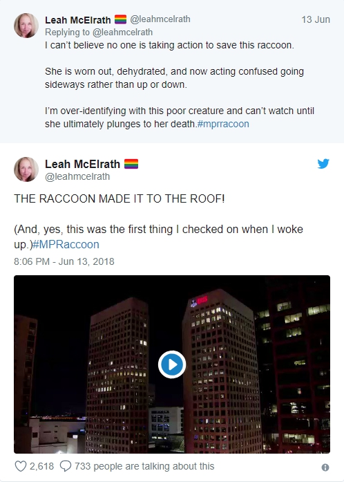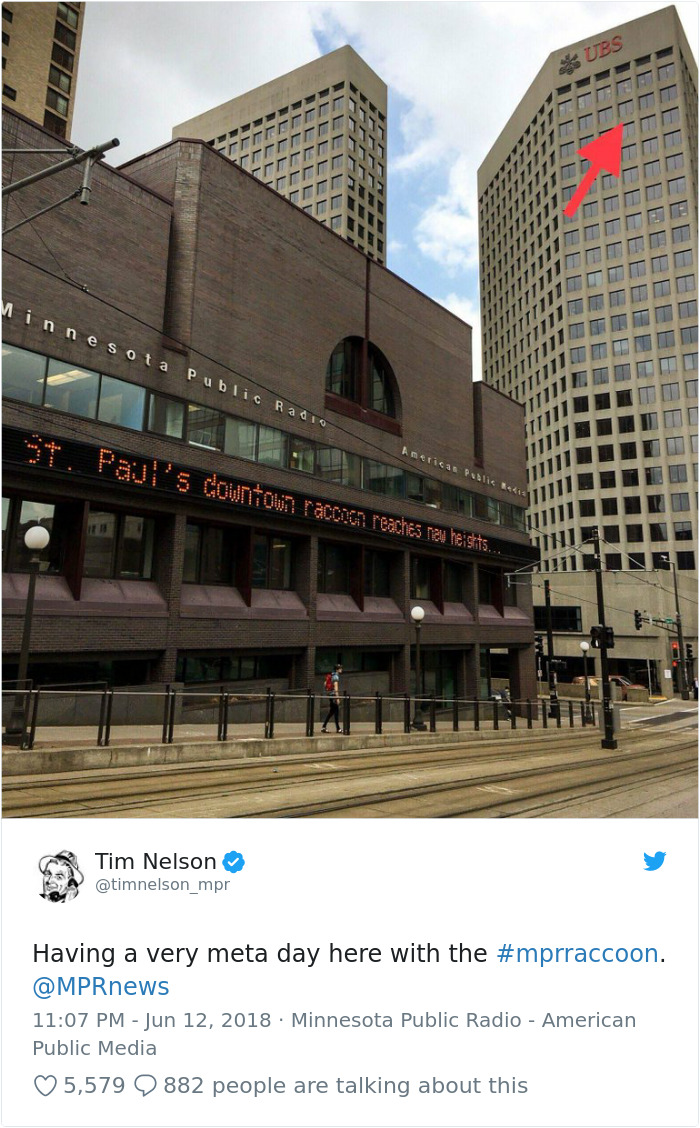 在美國總統川普與北韓領導人金正恩的會面結束之後,明尼蘇達州的一隻浣熊卻意外牽動了成千上萬美國人的心。原來這隻浣熊在 St. Paul 的 USB 摩天大樓莫名開始往上爬,居然接連爬到 12 樓層高的程度,許多 USB 大樓辦公室的上班族目擊了窗外的浣熊不斷在往高樓上攀升,深怕牠一不小心失足就會墜樓,這隻浣熊的照片在推特上被傳開之後,開始登上了美國新聞媒體,許多網友都在發表意見要如何拯救這隻浣熊。