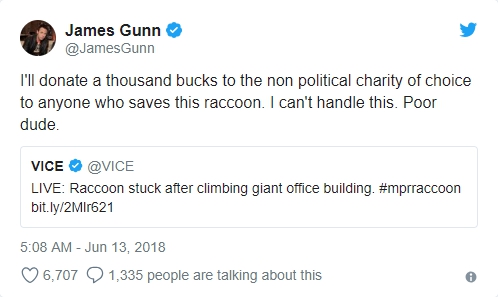 有趣的是,漫威超級英雄電影《星際異攻隊》(Guardians of the Galaxy)導演詹姆士·昆恩(James Gunn)還公開表示自己願意捐 1000 美元來拯救這隻浣熊,瞬間讓許多人聯想到了火箭浣熊這個角色,大讚浣熊真不愧是在《復仇者聯盟3:無限之戰》(Avengers: Infinity War)英勇存活的角色