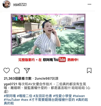 近日,蔡阿嘎固定單元【性愛小學堂】邀請到了人氣女優「友田彩也香」,片中蔡阿嘎與女優激情的以「健康小遊戲」模式互動,遊走18禁邊緣的超親密互動也讓嬌妻二伯在片尾表示:「準備搬回娘家住了」、「離婚手續都辦好了」、「菜桃貴的監護權一定是我的」,此言論意外讓各大媒體關注,離婚傳言登上新聞版面。