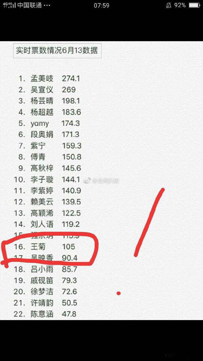 而15日晚間,有網友在微博上貼出疑似目前最新的點讚排名,其中,可以看到孟美岐第一,然後依次是吳宣儀、楊芸晴、楊超越、yamy、段奧娟、紫寧、傅菁、高秋梓、李子璇、李紫婷、賴美芸等,而上次在第二名寶座的王菊則落到了第16名,名次大幅下滑,令網友們都相當擔心,更有網友直呼「是不是有黑幕! 」。
