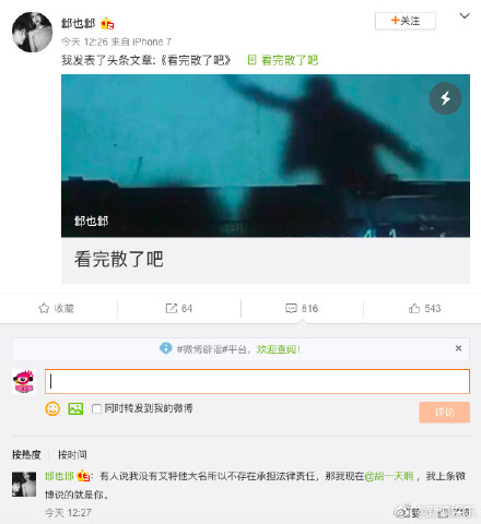 至於有網友砲轟「邶也邶」根本就是想藉著胡一天走紅,他也回覆「任何走紅方式對我來說都挺煩」正面否認網友的質疑。此外,對於網友們流傳的「邶也邶」整容前照片,她也回應「網上掛出來那個一吋照(證件照)不是我,還是別把無辜(的)人扯進來」。