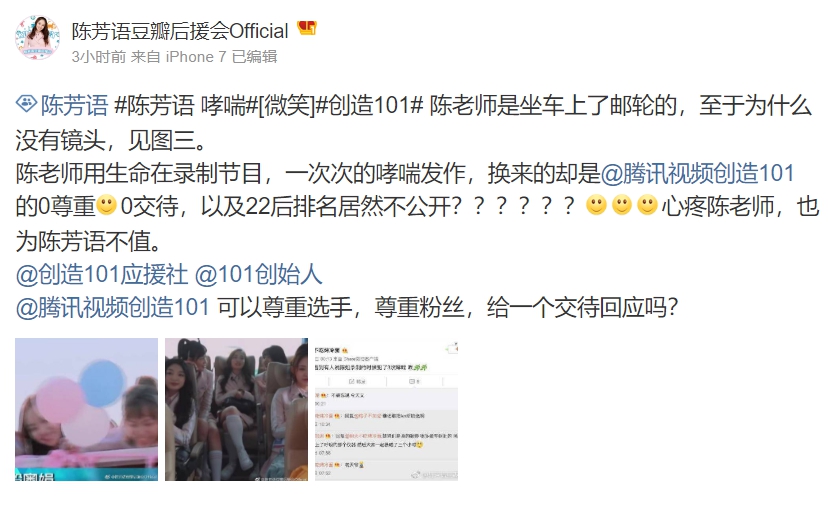 雖事後有不少知情人士出面澄清,陳芳語乃是因為身體不適,故沒有入住宿舍,亦沒有參與到大合唱,不過還是無法平息粉絲的怒火,他們質疑,鏡頭少得可憐不是只有這兩期才開始,而是連續好幾期都被這樣對待。粉絲直指:連最後的淘汰現場都沒有她,節目組要不要這樣欺負人?另外有不少網友痛批:節目組應該給觀眾一個合理的解釋!