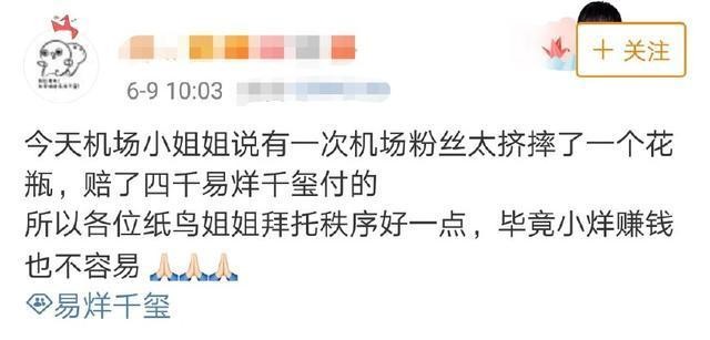 原來當時在機場時,粉絲們搶著要見到易烊千璽,彼此之間不斷的推擠,一不小心將價值人民幣4000元(約新台幣18900元)的花瓶打破了,由於當下粉絲沒有那麼多的現金,無法立刻解決賠償問題,因此留在機場解決問題,事後,易烊千璽透過工作人員了解情況,與機場人員溝通過後,自掏腰包付了所有的賠償費用,讓粉絲們知道後紛紛喊話之後在機場務必維繫好機場秩序,相當心疼易烊千璽「畢竟千璽賺錢也不容易」。