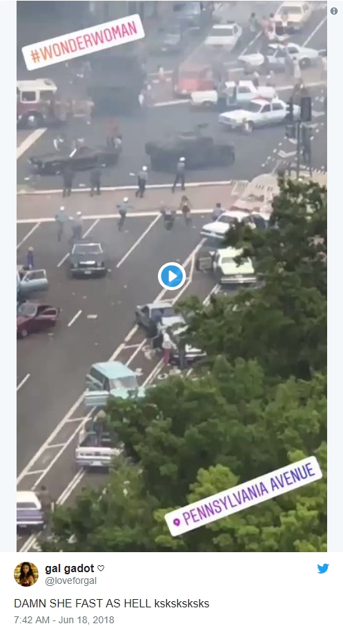 ▼不過另一段蓋兒加朵拍攝《神力女超人 2》的現場影片則被大量網友瘋傳,原來身高 178 公分的蓋兒加朵在賓夕法尼亞大道拍攝一場正面奔跑的場面,擁有修長美腿的她穿著神力女超人的緊身戰袍,對著攝影機全力狂奔,像風一般的速度感引起許多網友驚呼:「真不愧是在以色列當過兵的女人,在大太陽下跑這麼快!」、「愛死了這個女人,健康又性感」、「我盯著她的腿重覆看了好幾次」,《神力女超人 2》預定於 2019 年 11 月 1 日上映。