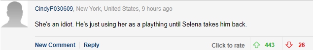 不過看見小賈斯汀熱吻海莉鮑德溫的影片曝光,卻引起了不少粉絲和網友反彈,有人指出:「我猜小賈根本一點都不愛海莉,他只是再利用她」、「海莉真是白痴,小賈只是利用她填補空虛,直到賽琳娜再度回來」、「這可憐的女孩毫無自我尊嚴」、「我還以為海莉與肖恩曼德斯在一起」。不過也有網友嘲諷小賈斯汀和海莉是一對絕配組合:「拜託小賈斯汀別再公開說賽琳娜是他的人生摯愛、靈魂伴侶,我覺得他跟海莉配在一起更剛好」、「我變得更不喜歡小賈斯汀了,他最好別再要求賽琳娜回到他的身邊」、「我希望他們保留好自己"骯髒的隱私",不用把他與海莉的戀情到處秀給別人看」。