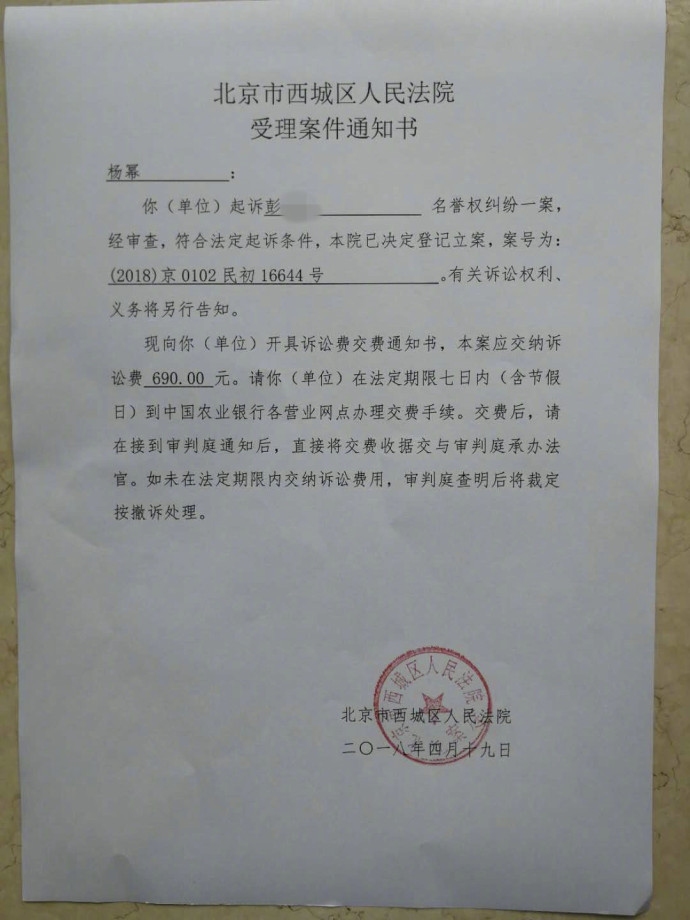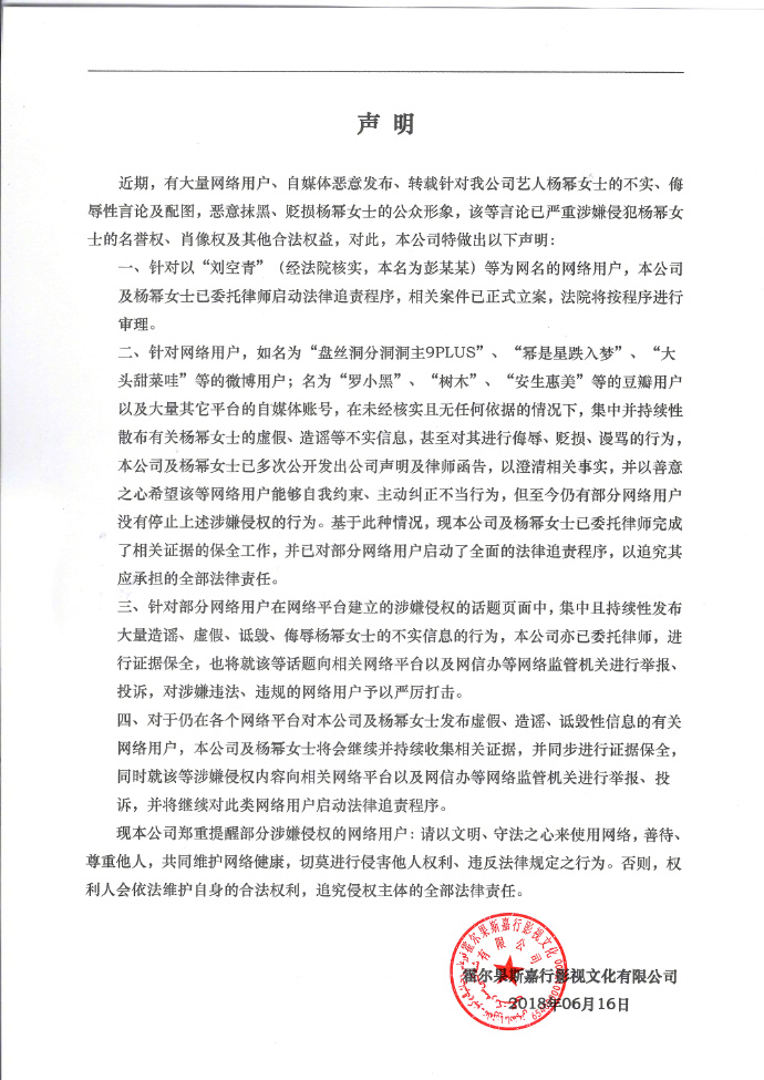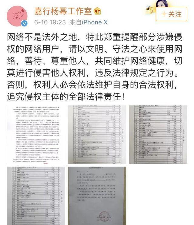 6月16日晚間,楊冪的工作室發布了一則聲明,點名將起訴部分網友,譴責網路暴力行為,直指「網絡不是法外之地,特此鄭重提醒部分涉嫌侵權的網絡用戶,請以文明、守法之心來使用網絡,善待、尊重他人,共同維護網絡健康。」此外,楊冪工作室也表示將「依法維護自身的合法權利,追究侵權主體的全部法律責任!」並附上法院的案件受理通知書照片,硬起來對所有黑粉提告,讓粉絲們狂讚,大呼過癮,更有粉絲表示「惡有惡報!已經忍很久了!」