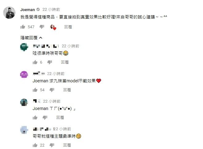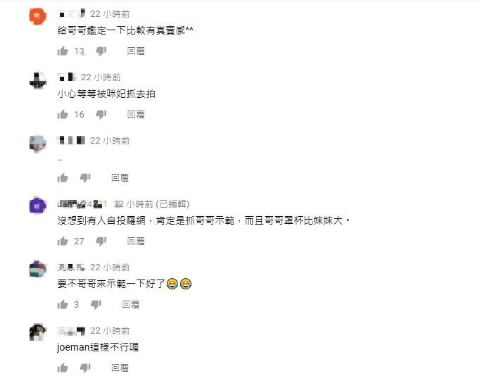 影片一出,成功吸引4萬多的觀看次數,就連好友Joeman敲碗求福利:「我是覺得這種商品,要直接拍到真實效果比較好喔!來自哥哥的誠心建議」,不少網友看到Joeman的留言,紛紛開玩笑說,「老司機?」、「這樣不行喔 」,不過也有人打鐵趁熱:「沒圖沒真相,這位哥哥說得太好了 」、「給哥哥鑑定一下比較有真實感。」