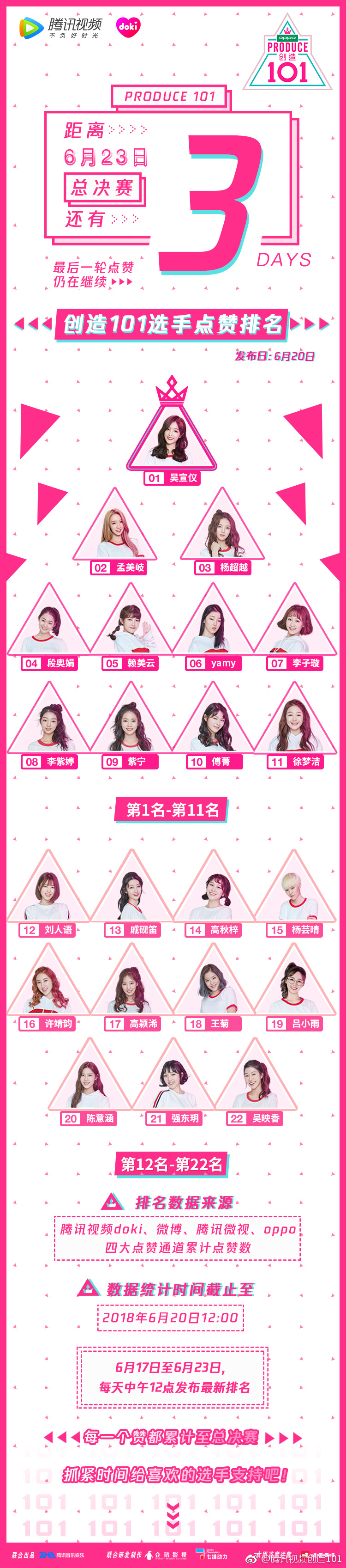 《創造101》是繼《偶像練習生》後最火紅的選秀節目,進行4個多月的封閉式訓練及錄製,節目預計於23日迎來總決賽,宣布由全民票選出11人組成全新偶像女團。101位練習生目前僅剩下22位留下,而每天的網路按讚排名都有不斷的變化,究竟最終的出道名單會有誰,都令粉絲們相當期待。