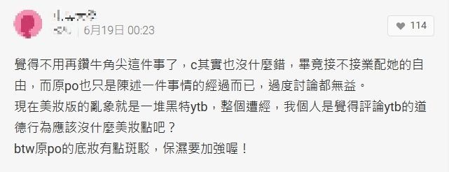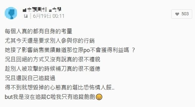 有網友看到Catie在社群網站發文,將它截圖傳至Dcard,「各種我這樣回應廠商會勾勾纏,所以我會適當的快狠準打蛇七吋,如果這樣網民也要酸來酸去我也是醉了,然後呼籲各位粉師們別隨雞起舞,網路酸民實在太可怕。」不少人在下方留言:「每個人真的都有自身的考量,尤其今天還是要求別人參與你的行銷,況且回絕的方式又沒有說真的很不禮貌」,也有人站在中立的角度:「覺得不用再鑽牛角尖這件事了,其實也沒什麼錯,畢竟接不接業配她的自由,而原po也只是陳述一件事情的經過而已,過度討論都無益。」