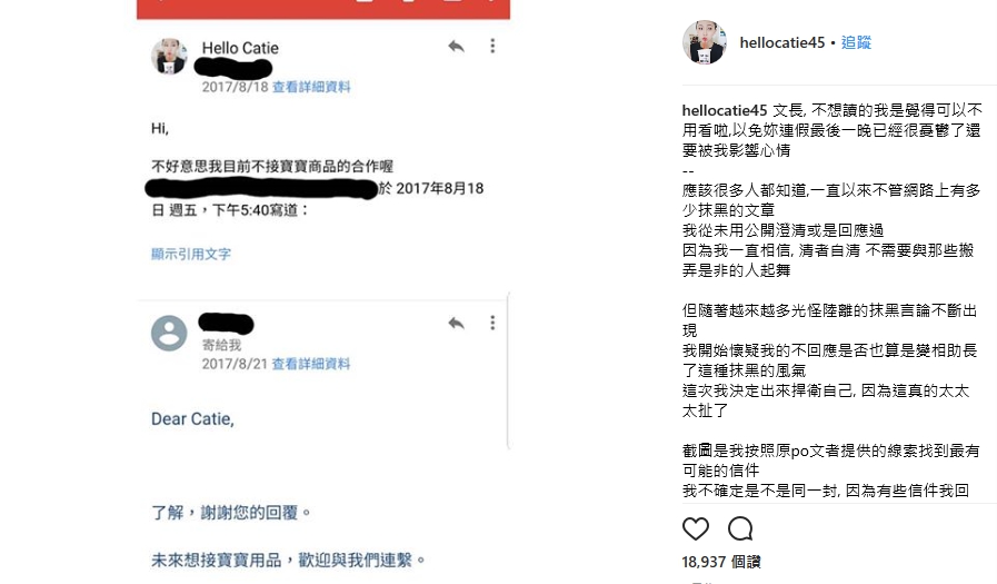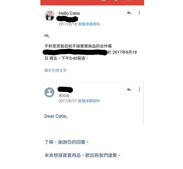 日前Catie曾拒絕一個寶寶用品的廠商邀約,但她衡量之後,認為自己「目前」不接寶寶用品合作,但該廠商發揮不屈不撓的精神,廠商不斷認真地推銷產品, 說東西真的很好很希望能合作,希望能試用看看,且逼問「目前」不合作的話,請問什麼時候可以?之類的問題,不過Catie表示,為了避免與廠商變成一來一往無止境的信件往來,她就會用上述比較簡短且不猶豫的語氣拒絕,「這樣我有做到通知、回覆,對方不會因為一直等待回音,而無法執行她工作的下一步,並且也可以免去雙方後續不必要的時間耗損。」