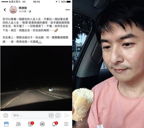 陳建隆20日突然PO出深夜行駛在馬路上的照片,寫道:「你可以牽著一個愛你的人走人生,不要拉一個試著去愛你的人走人生,『執意』是害她過的痛苦,放手讓她過想過的生活,有天懂了,一切就還原了,不懂,依然各自走下去,我扛、我踏出去,你自由的飛吧。」