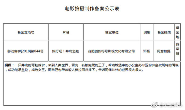 據陸媒《新浪娛樂》的報導,大陸廣電總局近日釋出許多新電影開拍的備案,其中,有一部動畫電影《旅行吧!井底之蛙》受到外界高度關注。劇情描述一隻井底之蛙威爾來到人類世界,冒充自己是一位被詛咒的王子,幫助城堡中的小公主蘇菲亞,碎皇叔班特的陰謀,最後成為女王的故事,而井底之蛙在回到井中後,也紛紛跟夥伴轉述外面的世界有多大的故事,預計在7月中旬上映。