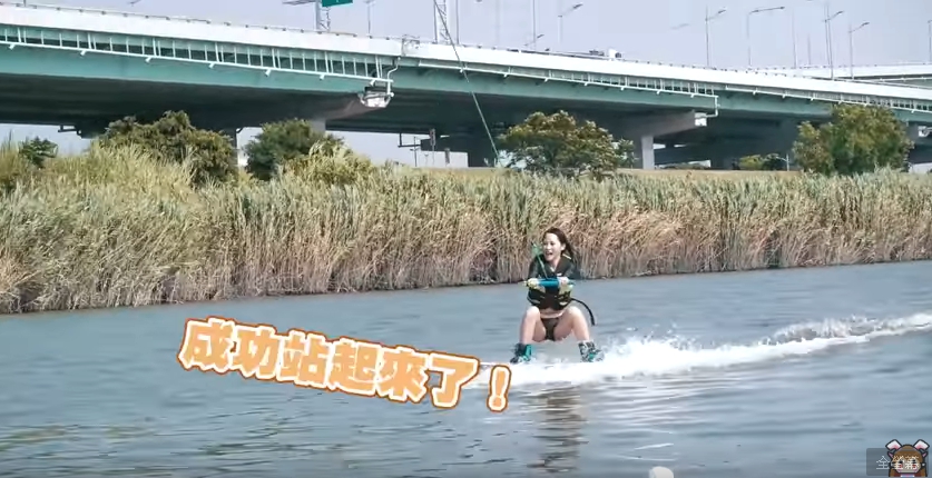 剛剛誇口很有自信的咪妃,才剛踩上寬板滑水時,就面有難色,表情相當驚恐,在滑水過程中甚至翻板跌入水中,為了能順利達陣,咪妃厚著臉皮向教練說,「可以開慢一點嗎?」,經過多次的練習後,咪妃終於成功站立,獲得教練的稱讚。